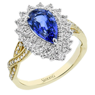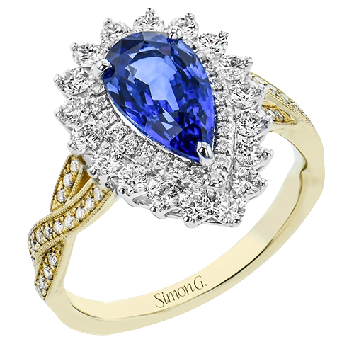 A unique color ring in 18K 2tone features a pear shaped sapphire center 2.56 ctw., surrounded by a double halo of white diamonds .76 ctw, and has a diamond accented yellow gold twist shank.