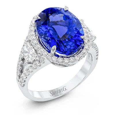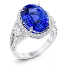 This wonderful 18k white gold vintage-inspired ring contains .57 ctw of half moon diamonds flanking the center 7.83 ct tanzanite, accented by .67 ctw of white round diamonds.