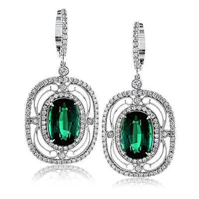 These exquisite vintage-inspired 18k white gold earrings contain delicate filigree and 1.12 ctw of white diamonds surrounding a gorgeous 7.12 ctw of green tourmaline.