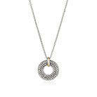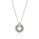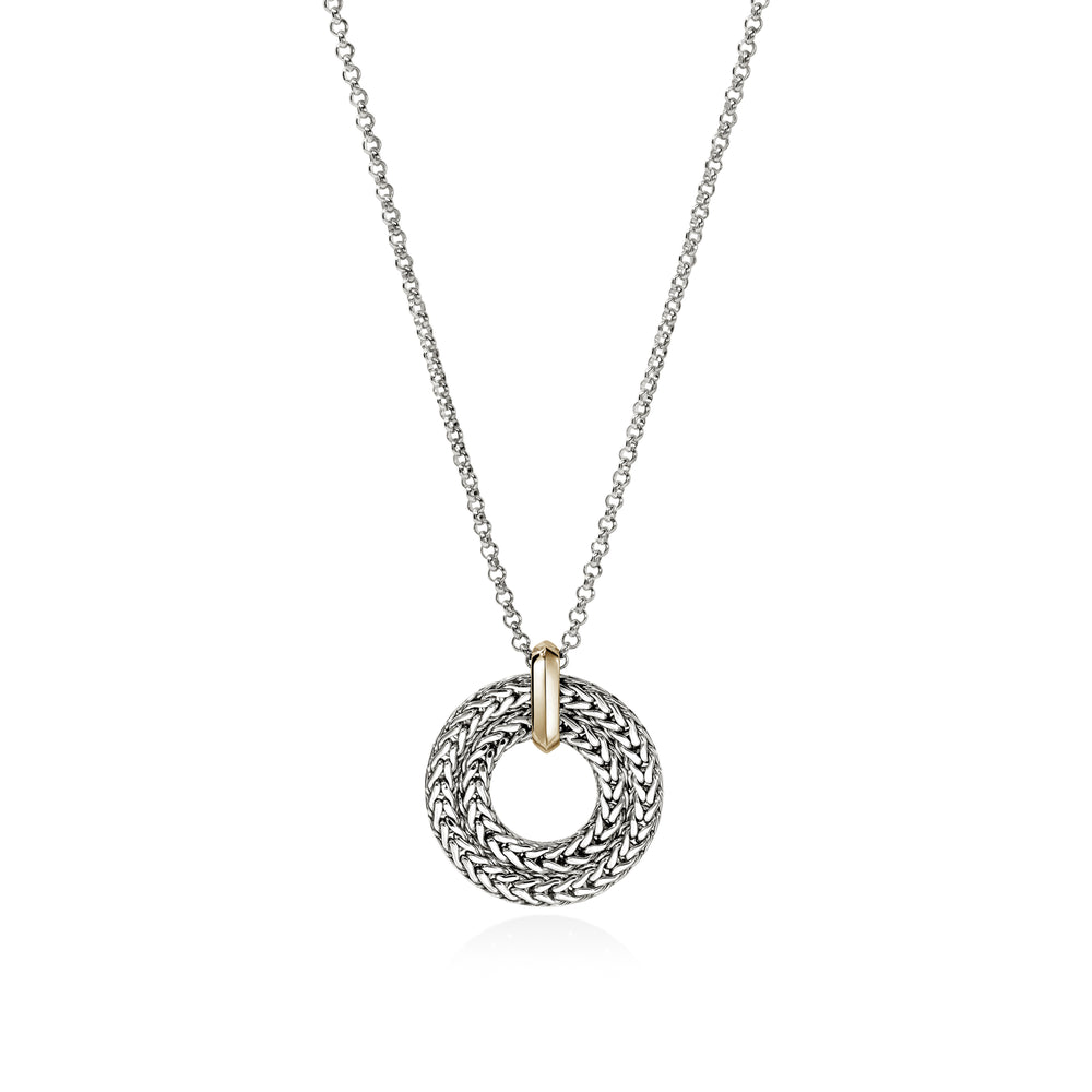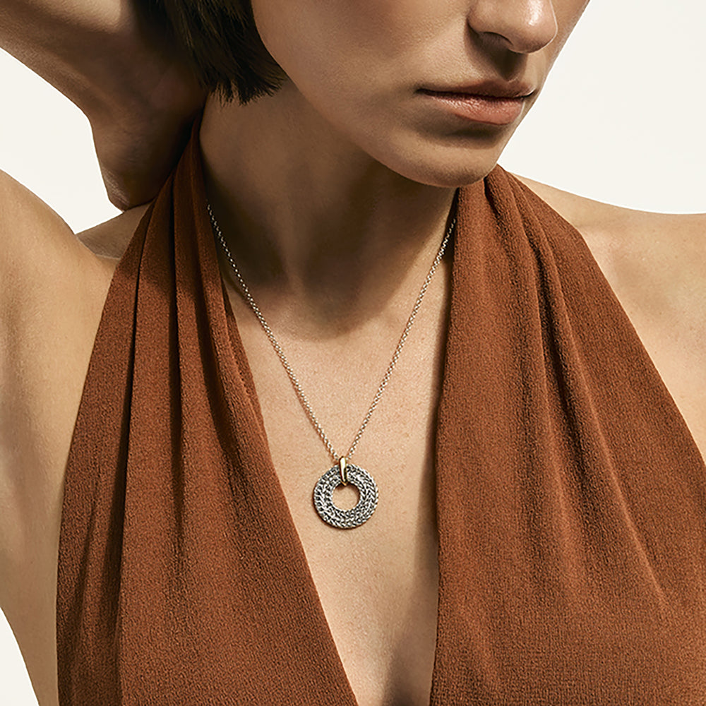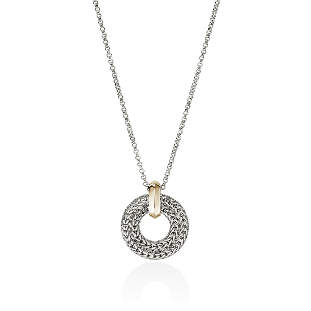 A low-profile pendant with a contrast knife edge link accent. Artisan handcrafted in reclaimed sterling silver and gold.