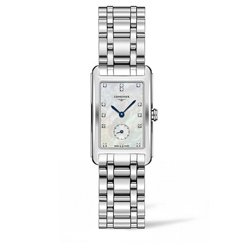 This elegant Longines DolceVita watch features a rectangular 23.30 x 37.00mm stainless steel case and water resistance up to 30 meters (100 feet). This watch is enhanced with a mother of pearl dial, diamond indicators and sapphire crystal. The functionality of this timepiece includes hours, minutes, and small seconds. End of Life (E.O.L.) feature. Explore the Longines L55124876.