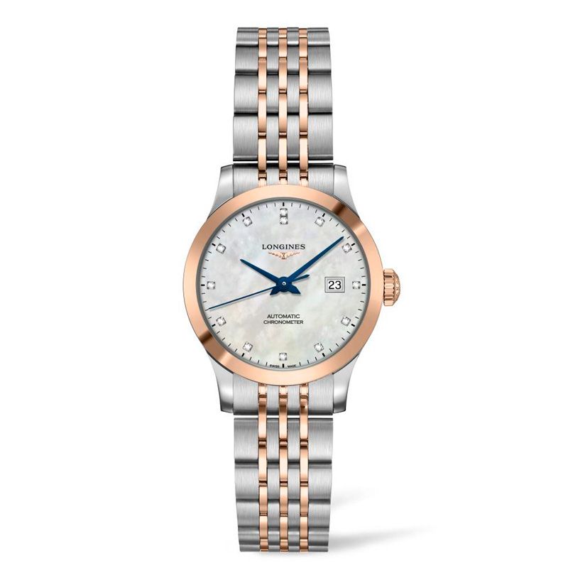 This classic Record automatic watch features a round 30.00mm stainless steel/gold cap 200 case and water resistance up to 30 meters (100 feet). This watch is enhanced with a mother of pearl dial, diamond indicators and sapphire crystal. The functionality of this timepiece includes hours, minutes, seconds and date aperture at 3 o'clock Explore the Longines L23215877.