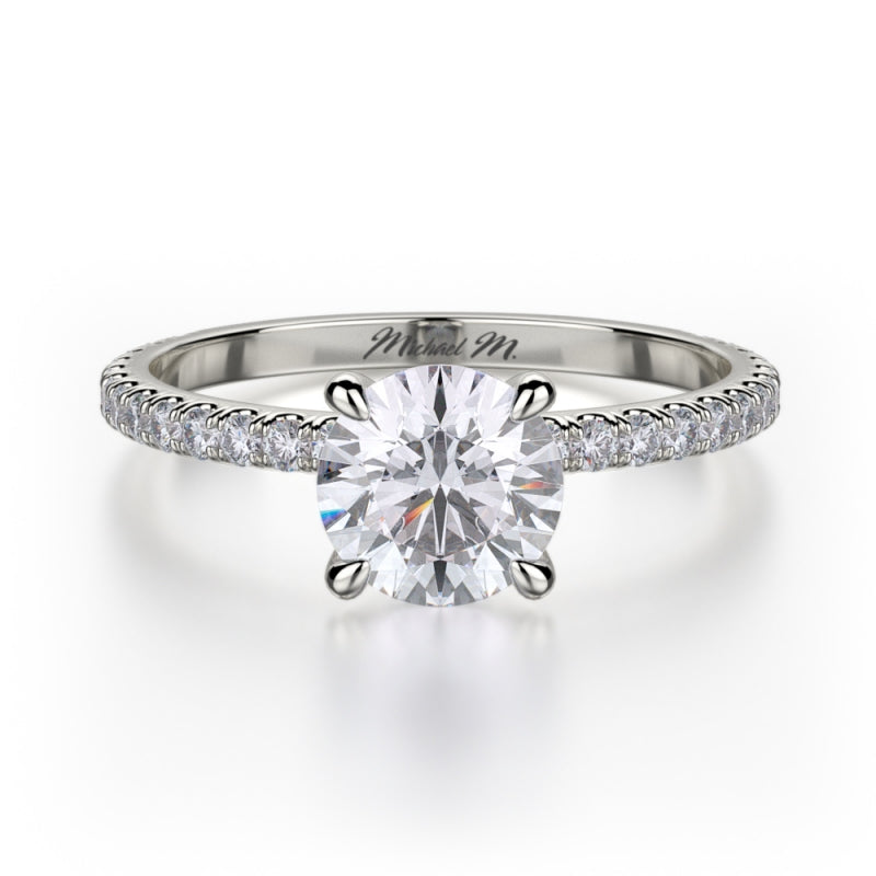 This Michael M engagement ring is displayed with a round center diamond (not included at time of purchase); holds 0.90 to 1.10 CTs. Adorned with 0.26 CTs in a prong setting. Available in Yellow and Rose 18k Gold. Price varies in Platinum.