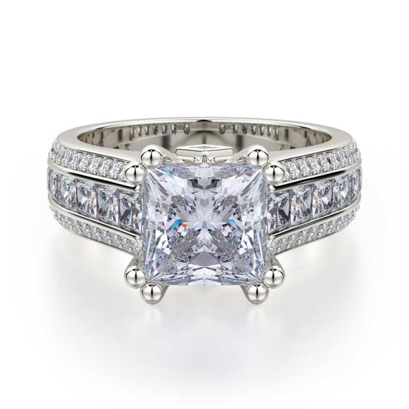 This Michael M engagement ring is displayed with a princess center diamond (not included at time of purchase); holds 1.40 to 1.60 CTs. Adorned with 0.85 CTs in a pave setting. Available in Yellow and Rose 18k Gold. Price varies in Platinum.