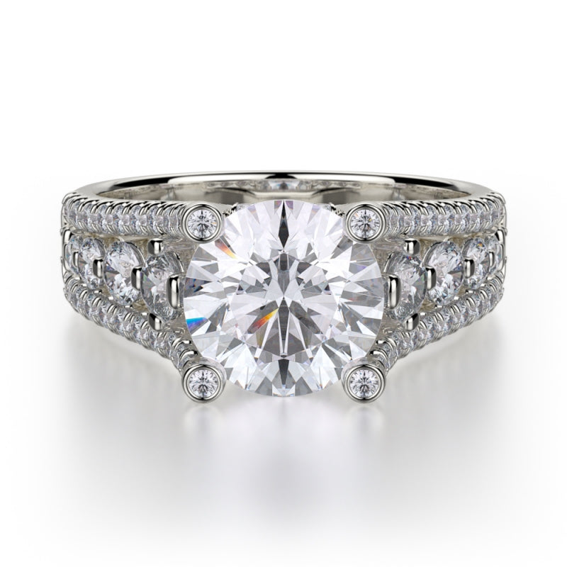 This Michael M engagement ring is displayed with a round center diamond (not included at time of purchase); holds 1.85 to 2.00 CTs. Adorned with 1.10 CTs in a prong setting. Available in Yellow and Rose 18k Gold. Price varies in Platinum.