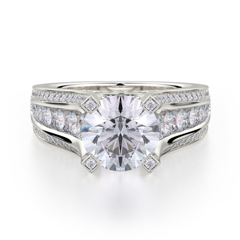 This Michael M engagement ring is displayed with a round center diamond (not included at time of purchase); holds 1.85 to 2.10 CTs. Adorned with 1.29 CTs in a channel setting. Available in Yellow and Rose 18k Gold. Price varies in Platinum.