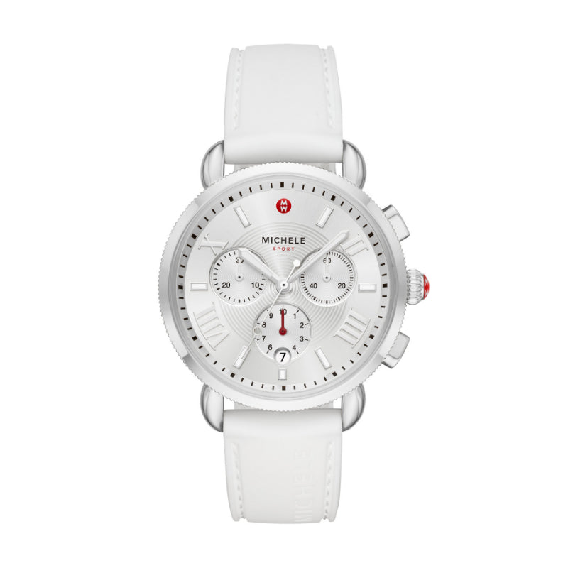 Designed with a modern silhouette, the Sporty Sport Sail features a chronograph movement, eye-catching stainless case, silver sunray dial with Roman numeral indexes and white silicone strap perfect for everyday wear. The 18mm silicone strap is made specifically for the Sporty Sport Sail Collection and is interchangeable with any 18mm MICHELE strap.