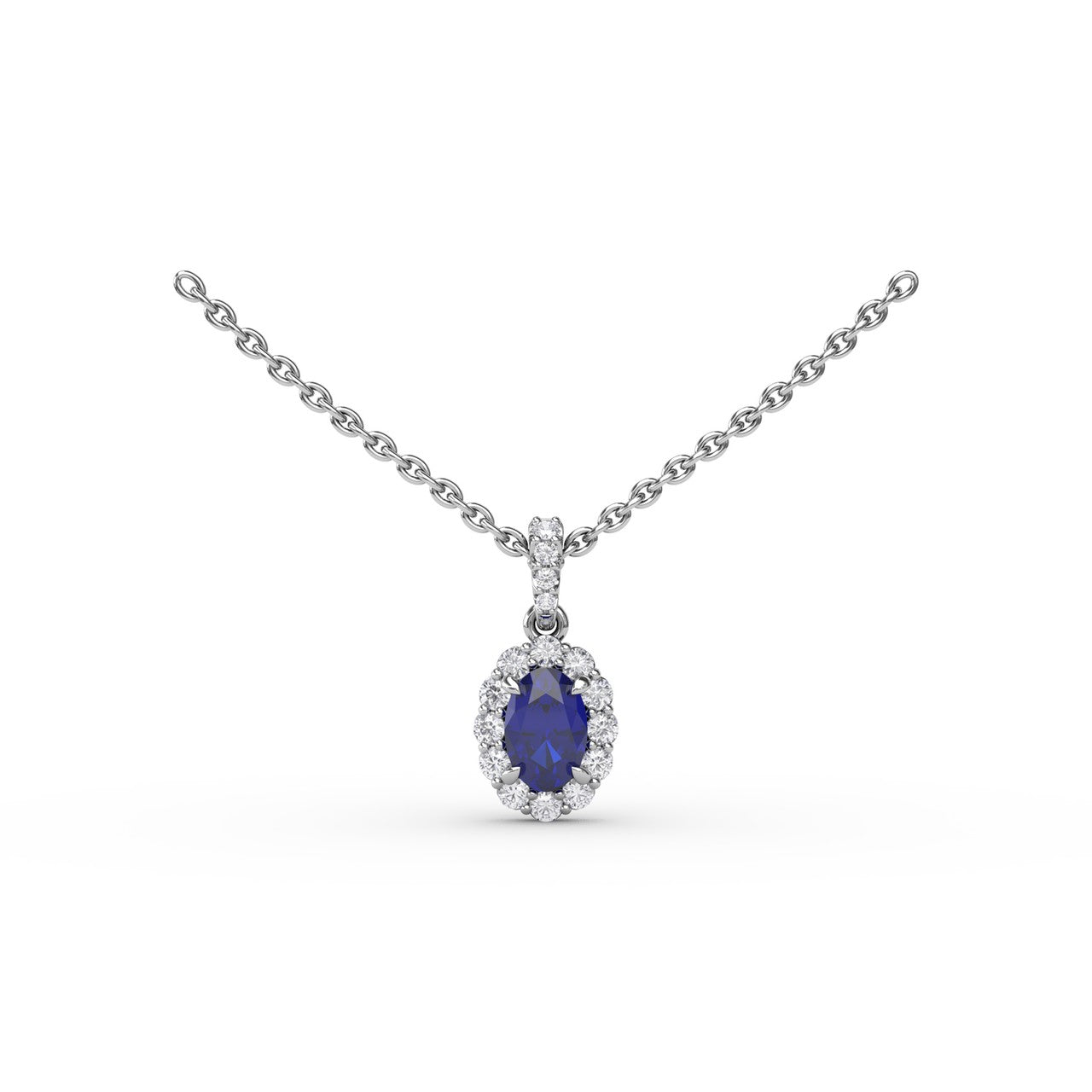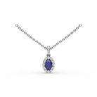 Accessorize your everyday look with this sapphire and diamond halo necklace. This necklace comes in a variety of material types like 14k white gold, yellow gold, rose gold and can be customized. Classic Fana gemstone necklaces are perfect for that special woman in your life.