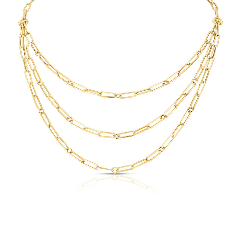 Bold and luxurious, this 18K yellow gold necklace features three strands of sleek paperclip links accented with sparkling diamonds for layered dimension and refined shimmer. Modern and versatile, it can be worn alone as a statement piece or paired with other necklaces for a curated, contemporary look.