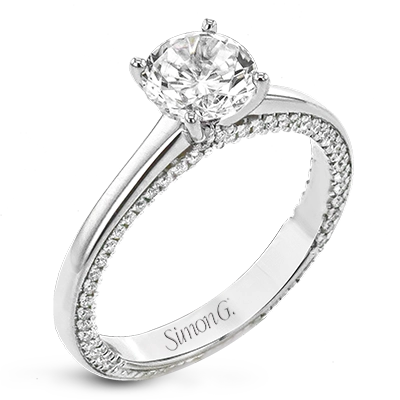 While lines of diamonds extending down both sides of this engagement ring, the round center stone is enhanced by the pure beauty of the 18k white gold on top.