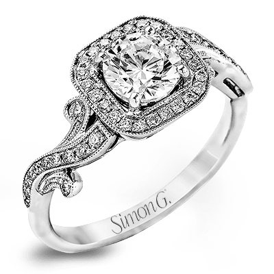 Featuring an elegant design, this white gold classic engagement ring is accented with .25 ctw round cut white diamonds.