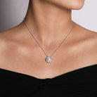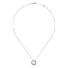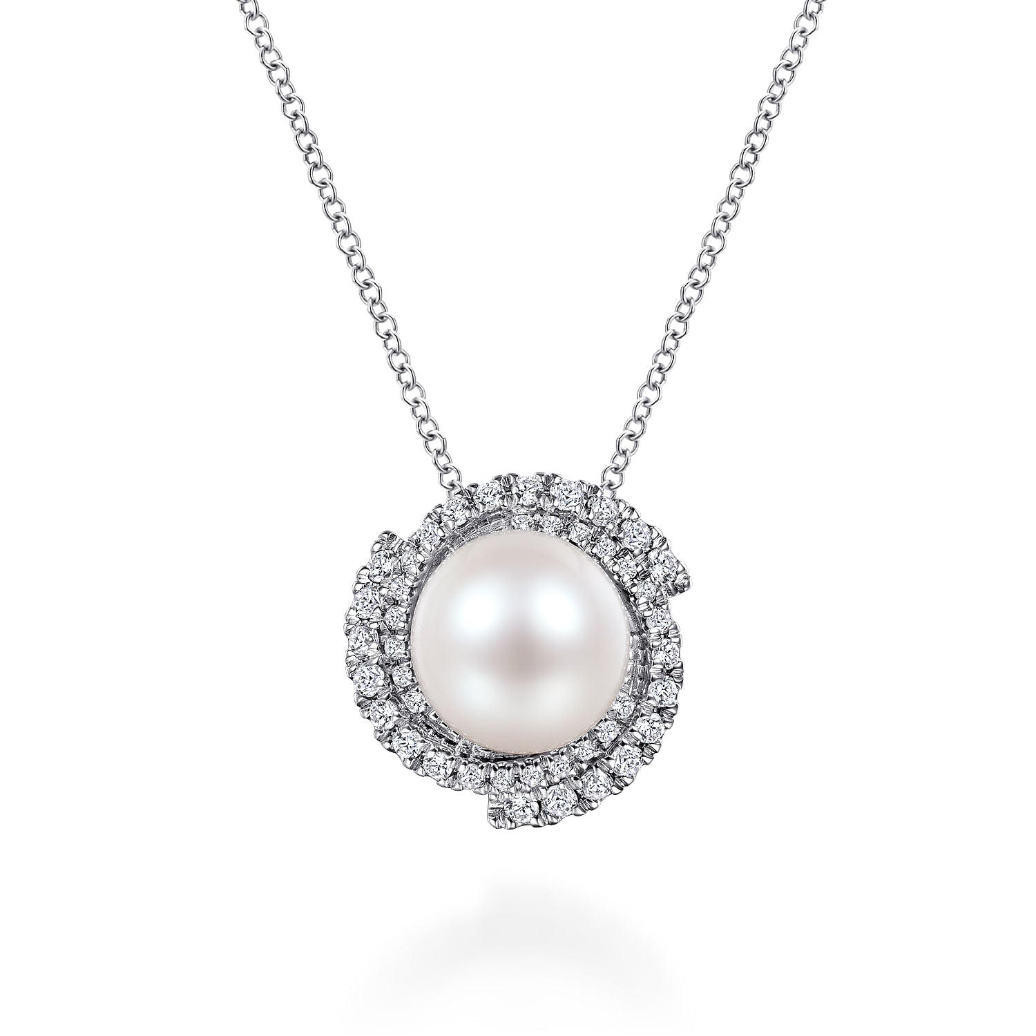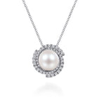 You're reviewing: 14K White Gold Round Cultured Pearl Swirling Diamond Halo Pendant Necklace