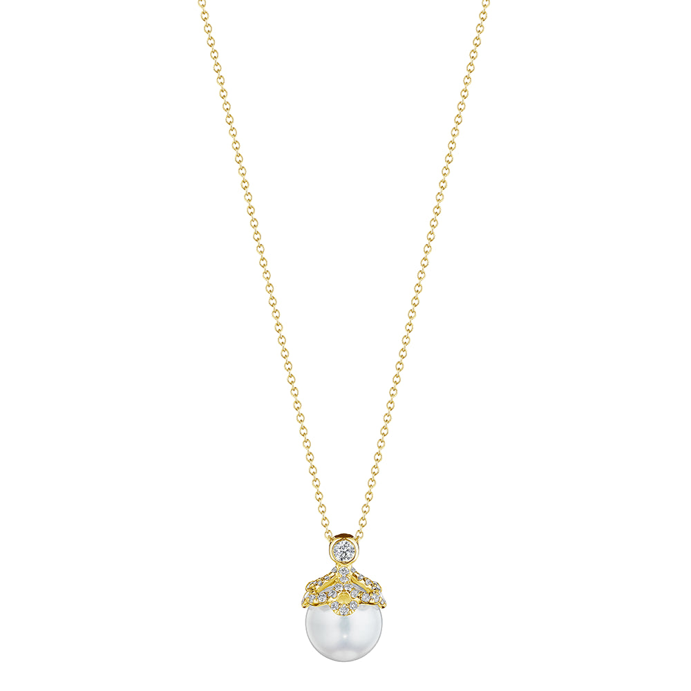 Elevate your look with the 18K yellow gold Reverie Floret Diamond and Pearl Cap Pendant. With its intricate design and timeless beauty, it's perfect for any occasion. Diamonds and pearls add extra elegance.