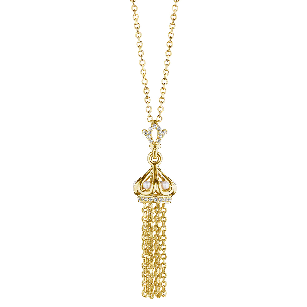Elevate your look with the 18k yellow gold Reverie Tassel Pearl Pendant. This classic piece with delicate pearls captures the spirit of sophistication and beauty.