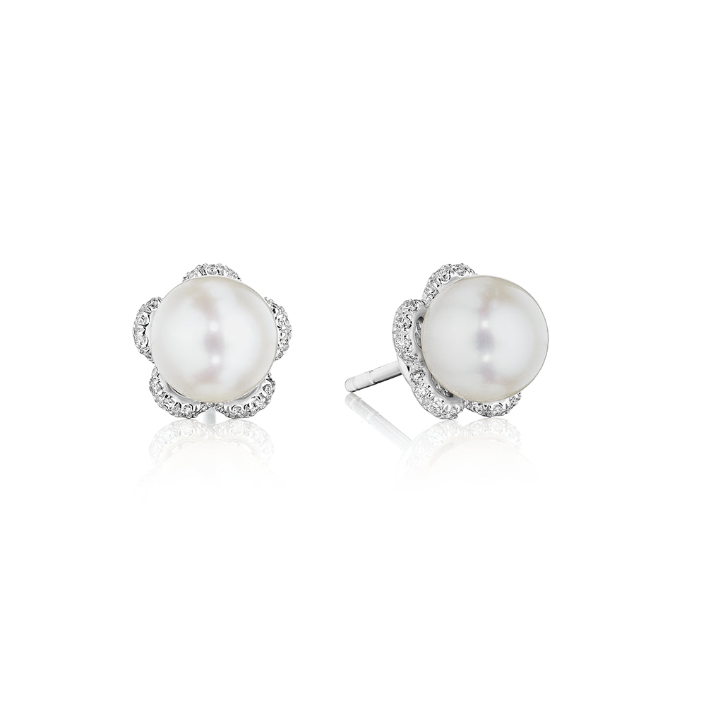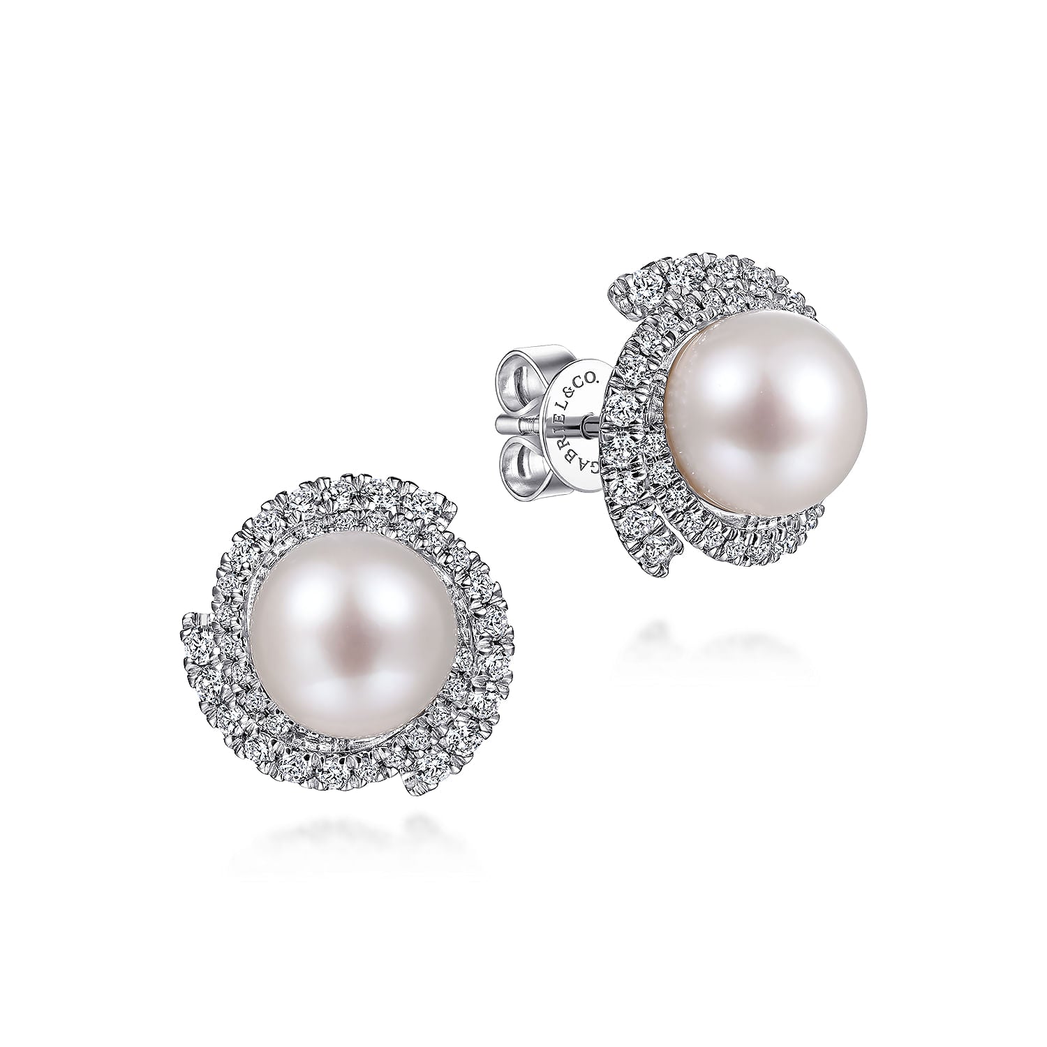 14K White Gold Round Cultured Pearl Swirling Diamond Halo Stud Earrings