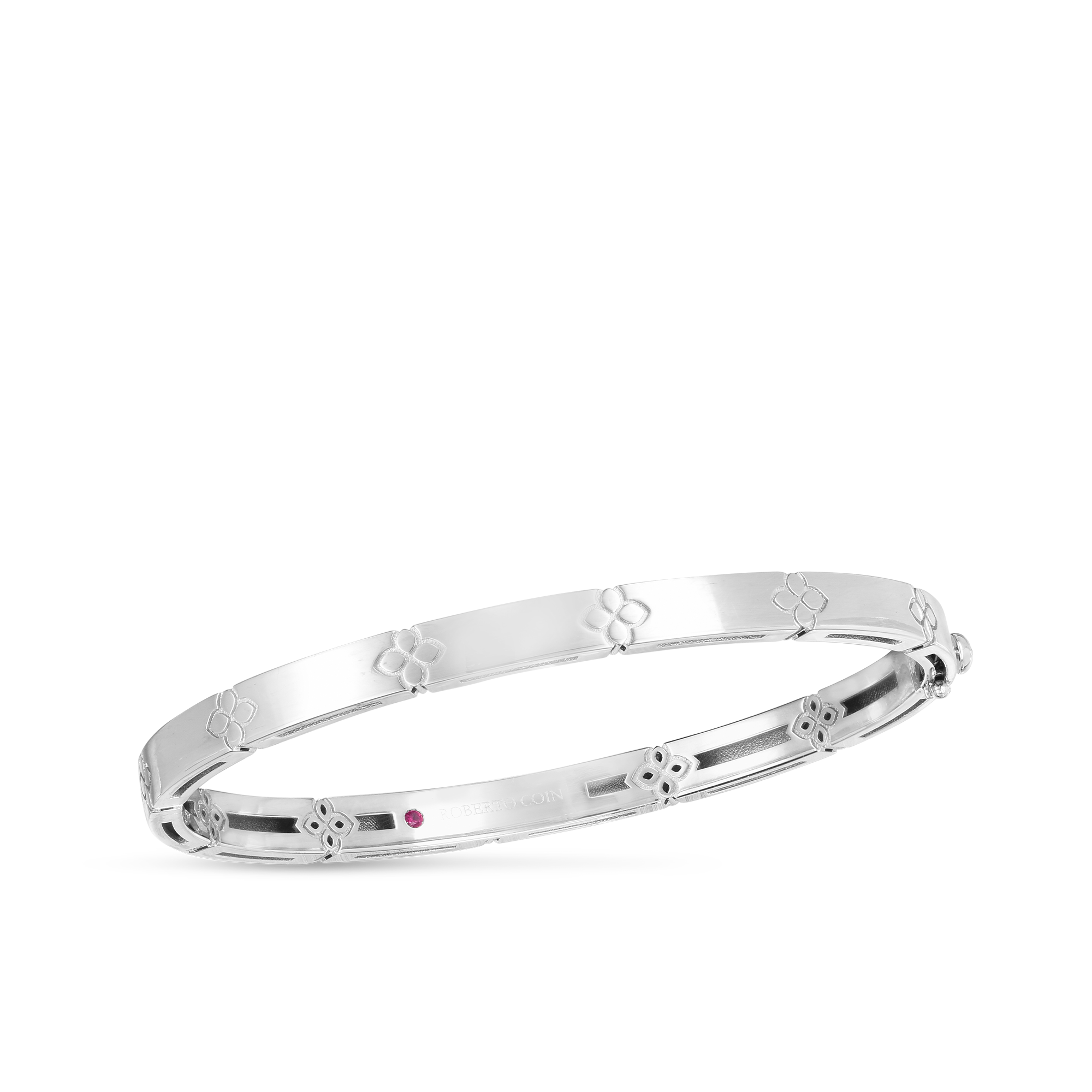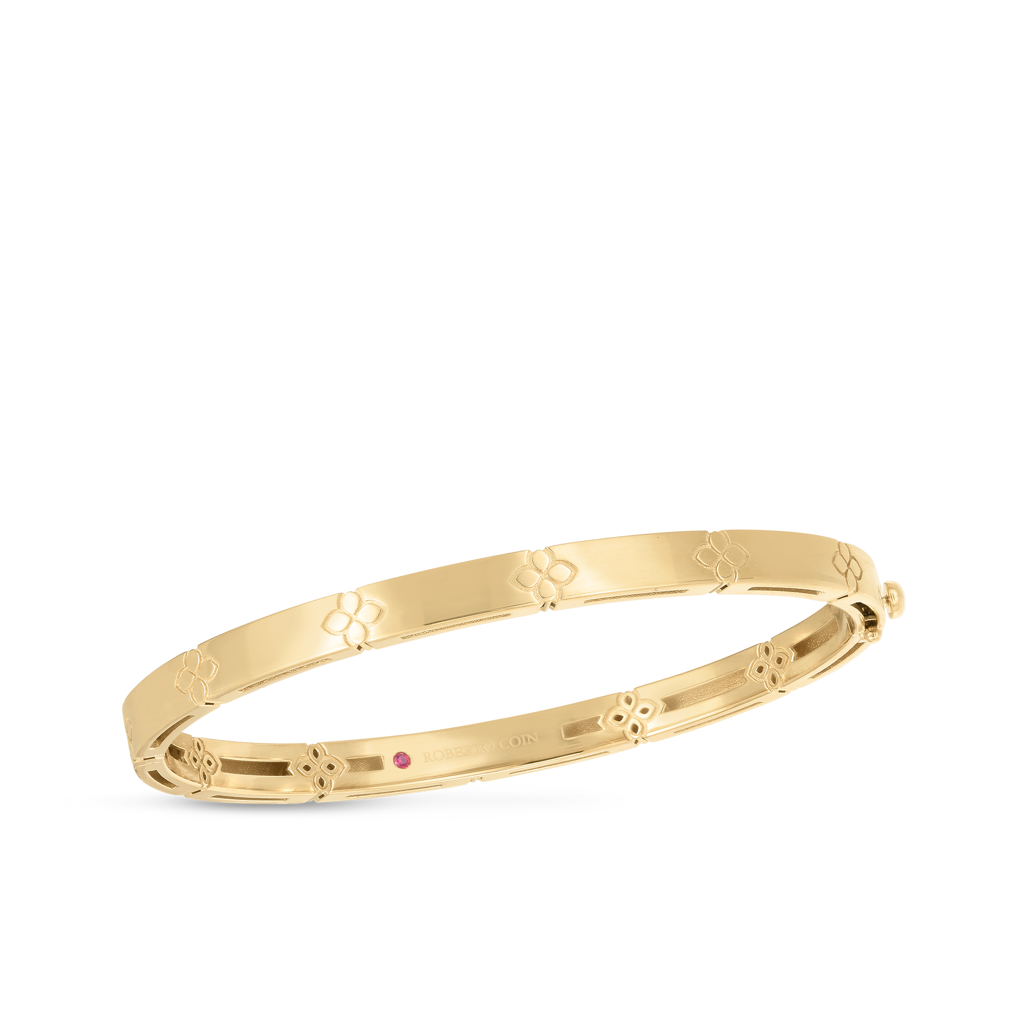 This Love in Verona bangle is crafted in radiant 18K gold, featuring a narrow-width design that exudes understated elegance. Its sleek, polished finish enhances refined piece that effortlessly complements any ensemble. Ideal for layering with other bangles or wearing solo, this bangle brings a touch of timeless sophistication and modern charm to your jewelry collection.