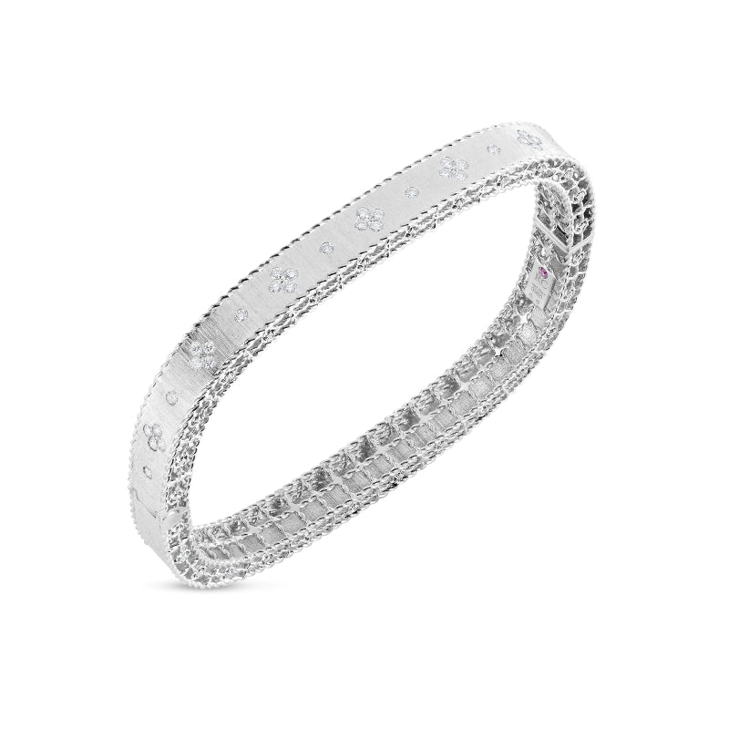 You're reviewing: Roberto Coin Satin Finish Slim Bangle With Fleur De Lis Diamonds - 18K White Gold