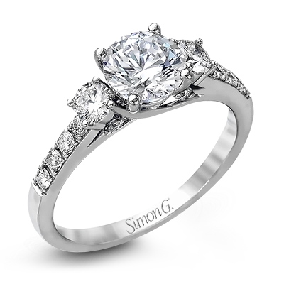 This classic three-stone engagement ring features .24 ctw of round brilliant side stones and .23 ctw of white diamonds extending down the sides.