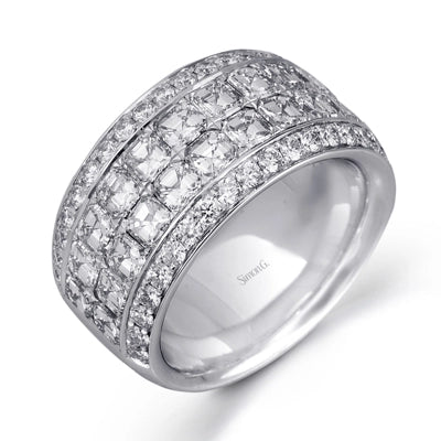 The classic design of this white gold band is highlighted by .78 cttw round cut white diamonds with 3.12 cttw of Asscher cut diamonds.