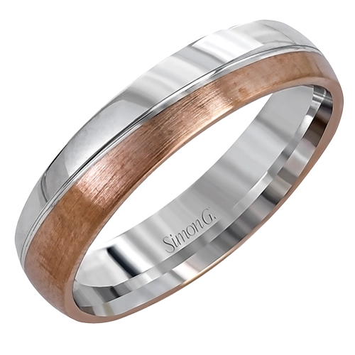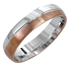 Reflecting a modern design, this two-tone men's wedding band features a sleek ribbon of white gold surrounded by two columns of brushed rose and white gold.