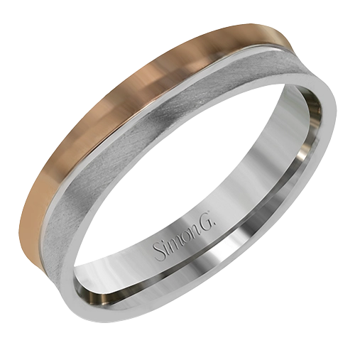 This contemporary men's band has a slim width and a two-toned design with rose gold on one side and white gold on the other.