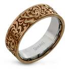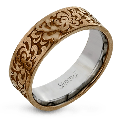 This wedding band's elegant, textured design in rose gold is accented by a simple white gold interior