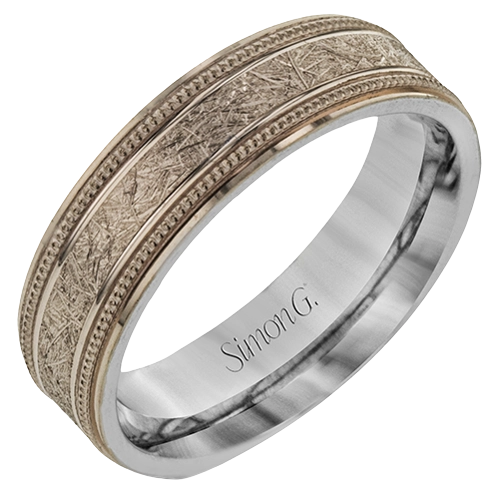 Brushed texture and a milgrain detail give this rose and white gold wedding band a classic, yet modern feel