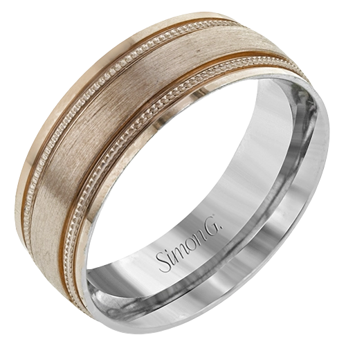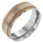 A textured rose gold exterior conceals a classic white gold interior in this elegant, modern wedding band