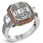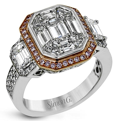 Make a bold statement with this diamond ring from the mosaic collection. Set in 18k white and rose gold, this ring features over 3cttw of white diamonds and .18cttw pink diamonds.