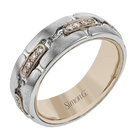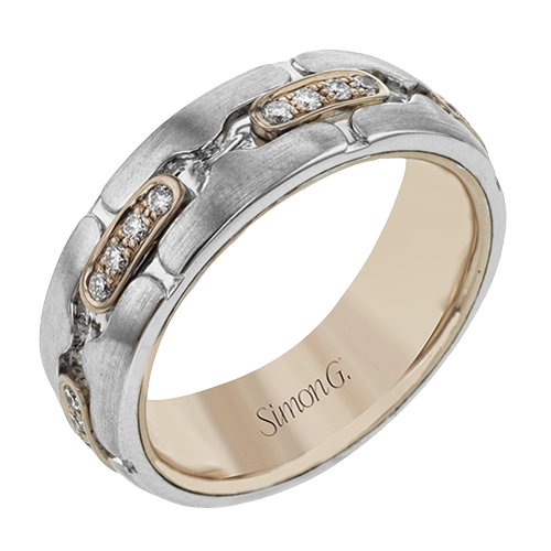 .35 ctw of white diamonds highlight the unique, eye-catching puzzle piece design of this white and rose gold wedding band