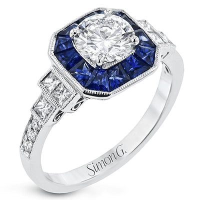 This 18k white gold engagement setting would be a perfect 'something blue' with .79 ctw of baguette sapphires in a halo surrounding the center stone. These are framed by .33 ctw of princess cut diamonds and .11 ctw of round brilliant diamonds.