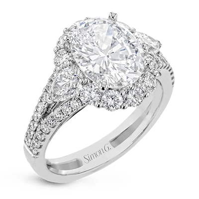 This glamorous white gold ring features 1.01 ctw of round white diamonds and .62 ctw of pear shaped white diamonds as a dazzling backdrop for the center stone