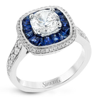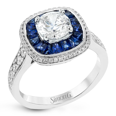 Specially shaped sapphires formed a halo around the center stone in this remarkable engagement ring, accented by .42 ctw of white diamonds as well.