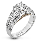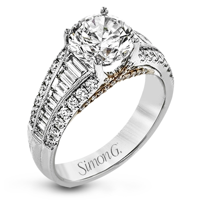 This distinctive ring features a center row of .75 ctw of baguette diamonds outlined on either side by .43 ctw of round diamonds.