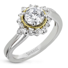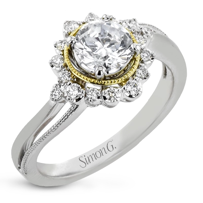 Full of interesting design details, this engagement ring from our Supernova collection features a yellow gold milgrain halo around the center stone, and an outer halo set with .20 ctw of white diamonds.