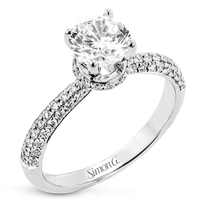 18K white gold enagement rings with .43cttw micro pave set diamonds including an under halo design. (*center stone sold separately)