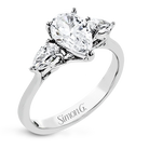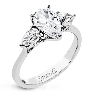 This distinctive three stone ring is new take on a classic style, with .45 ctw of pear shaped side diamonds highlighting the pear shaped center stone.