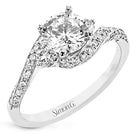 Contemporary 18 kt white gold engagement ring has a subtle knife edge and 2 diamonds of .21 ctw flanking the center, accented with a swirl of round diamonds .27 ctw