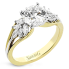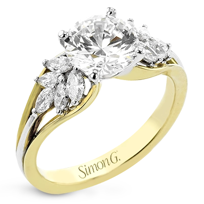 18 kt. floral inspired engagement ring has a yellow gold split shank and marquise side diamonds of .41 ctw set in white gold, along side the center stone creating the look of glimmering leaves