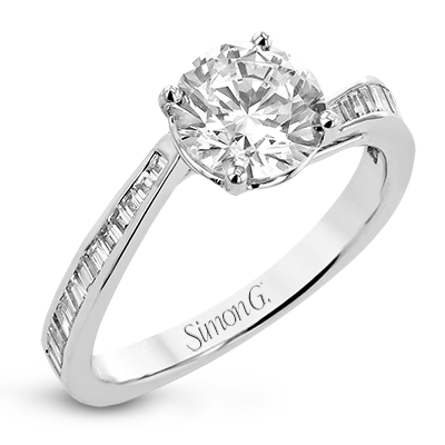 This engagement ring in 18 kt white gold has a gentle curved band of sparkling baguettes 0.39 ctw.