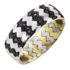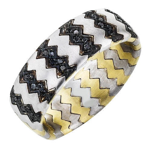 This distinctive men's band features a zig zag pattern in two tones of 14k gold set with .18 ctw of black diamonds.