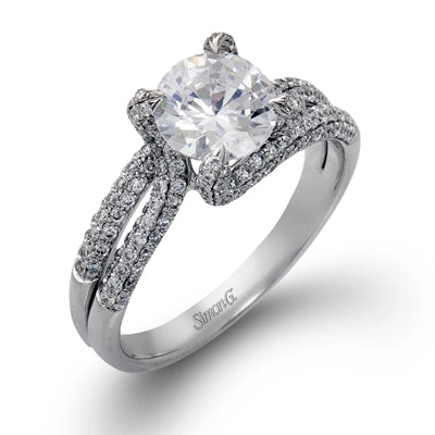 This lovely engagement ring showcases .59 ctw of white diamonds in a unique design.