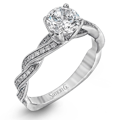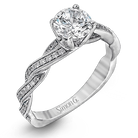 This exquisite white contemporary engagement ring features a delicate twist design on the band accented by .22 ctw of sparkling round cut white diamonds.