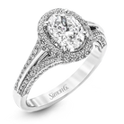 This lovely 18k white gold engagement ring design is created for an elegant oval center stone and features .77 ctw of white diamonds accented by a small touch of .03 ctw of yellow diamonds.