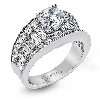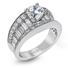 This eye-catching contemporary white gold engagement ring is accented by .75 ctw round cut white diamonds and 1.26 ctw baguette white diamonds for an unforgettable look.