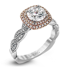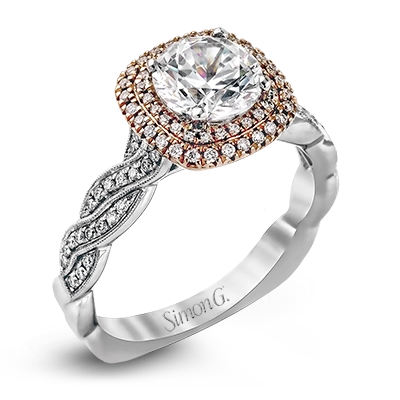 The distinctive twisted design on the band of this contemporary white and rose gold engagement ring is complemented by a gorgeous geometric setting featuring .25 ctw of round cut white diamonds.