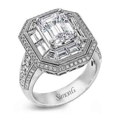 This gorgeous white gold contemporary engagement features an arresting 1.65 ctw of mosaic diamonds accentuated by .80 ctw of princess cut white diamonds.