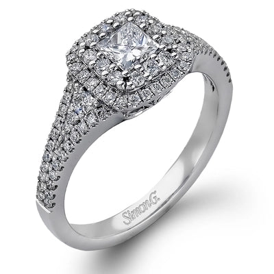 This vintage 18K diamond engagement ring is made for a princess cut center stone, has a cushion shaped double halo and diamonds on the shank 0.51 ctw.