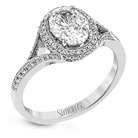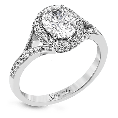 Elegant and sophisticated, this white gold ring's delicate halo and split shank glitter with .28 ctw of round white diamonds to highlight an oval shaped center stone.