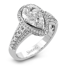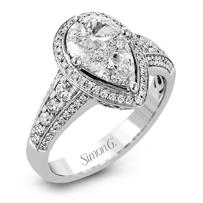 This remarkable 18k white gold ring contains a 1.28 ctw two-piece mosaic center which creates the look of a pear shaped diamond. This centerpiece is accented .48 ctw of white round brilliant diamonds.